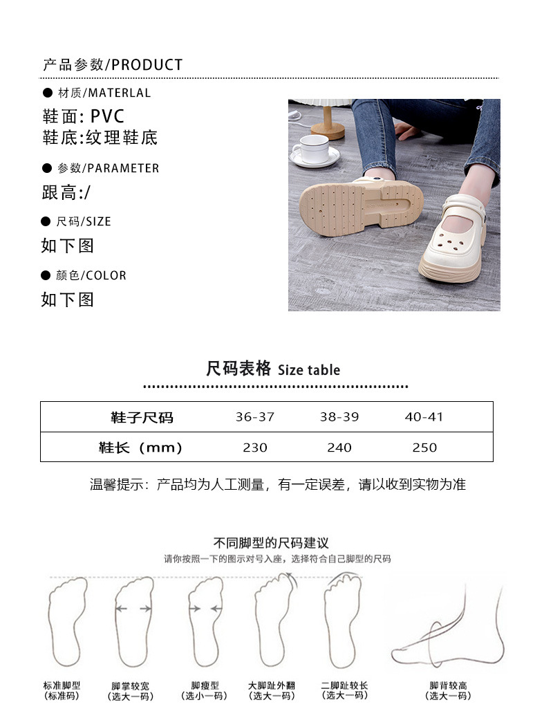 本店所有商品都是实物实拍,塑料鞋如遇到有压扁的情况,可用吹风机吹热,就能恢复原形,产品弹性很强,请各位放心