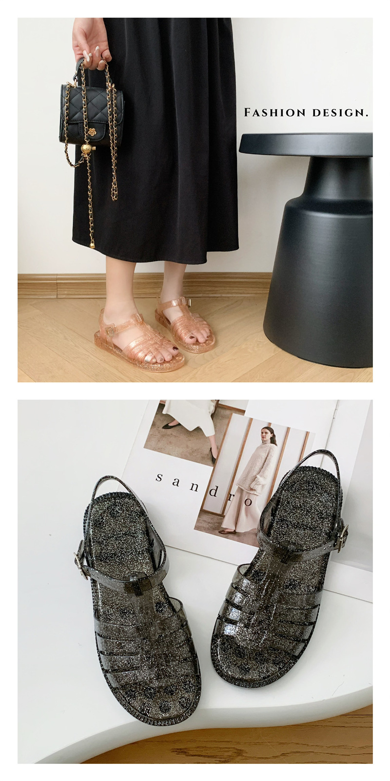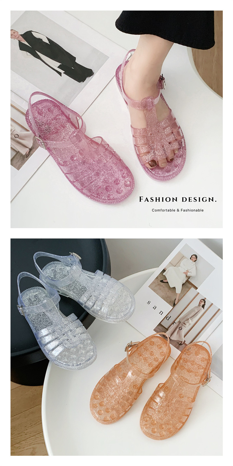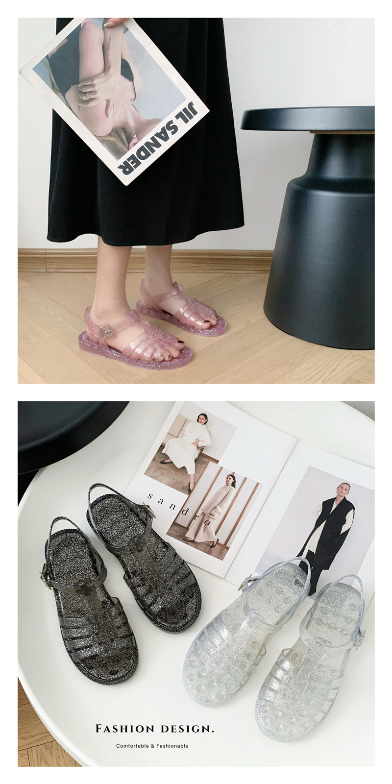 • 合利鲨夏季罗马女凉鞋平底透明沙滩鞋时尚镂空平跟外穿休闲凉鞋